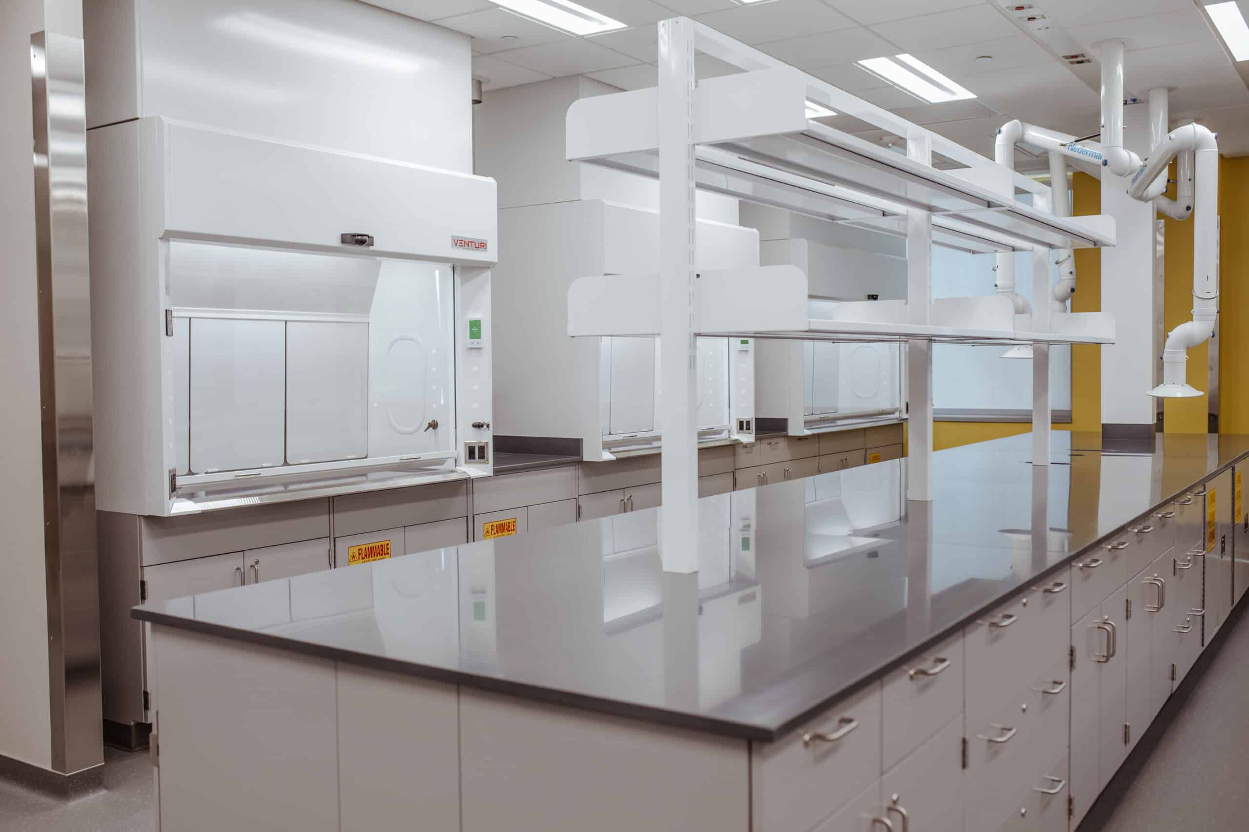 Each lab was outfitted with satin grey cabinets and tables, snow white wall cabinets and shelving/hoods, slate Kemresin worktops, and accent walls for each discipline. This was a refreshing change from the typical one-color concept.