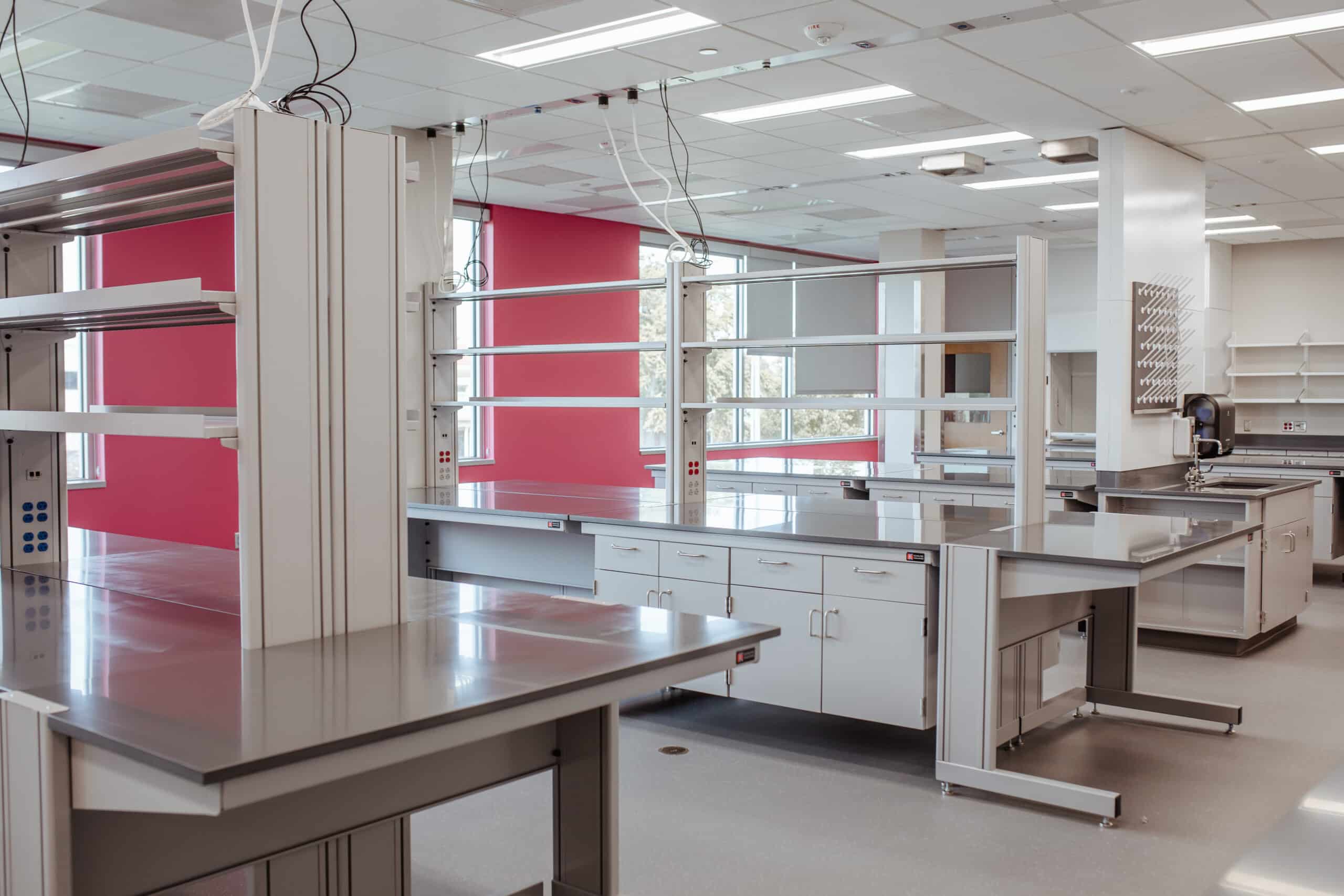 Each lab was outfitted with satin grey cabinets and tables, snow white wall cabinets and shelving/hoods, slate Kemresin worktops, and accent walls for each discipline. This was a refreshing change from the typical one-color concept.