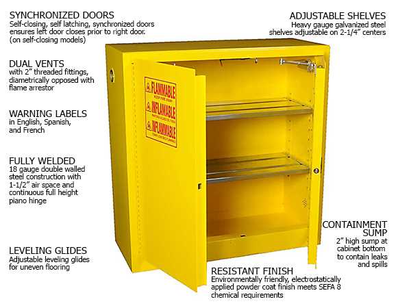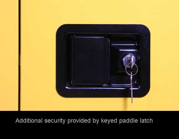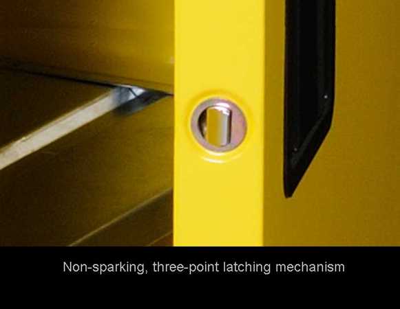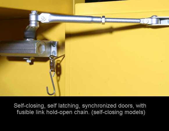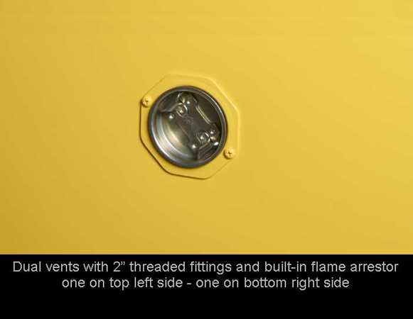 Dual vents with 2″ threaded fittings and built-in flame arrestor. One on top-left side, one on bottom-right side. Non-sparking, three-point latching mechanism. Self-closing, self-latching, synchronized doors, with fusible link hold-open chain. (self-closing models) Additional security provided by keyed paddle latch.